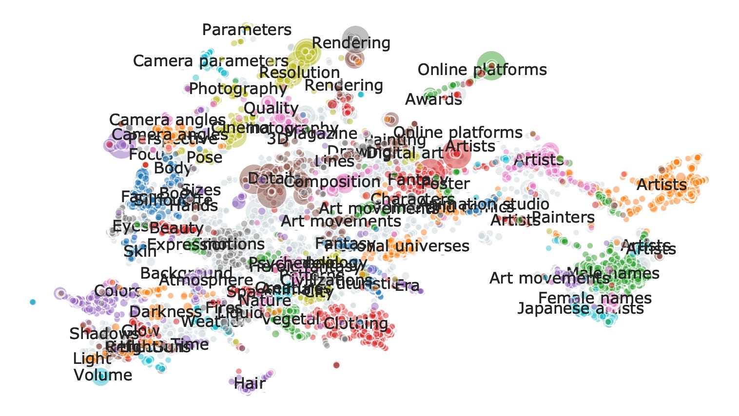 Jâai trouvĂ© un petit projet trĂšs intĂ©ressant qui recense, Ă lâaide dâun arbre interactif, les prompts entrĂ©s par les utilisateurs de stable diffusion.
